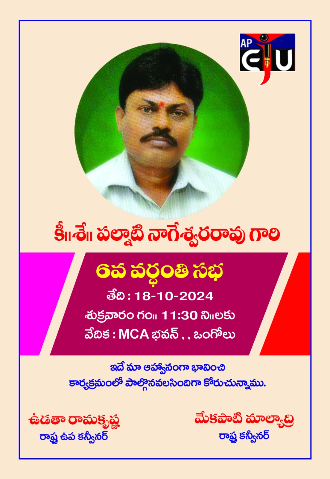 ఒంగోలు పట్టణంలోని ఎంసీఏ భవన్ లో ఏపీఈజేఏ వ్యవస్థాపకులు, ఏపీఈజేయు ఏర్పాటుకు ప్రేరేపించిన వ్యక్తి, గొప్ప మానవతావాది పల్నాటి నాగేశ్వరరావు 6వ వర్ధంతి సభ ఏపీఈజేయూ ఆధ్వర్యంలో నిర్వహించారు.